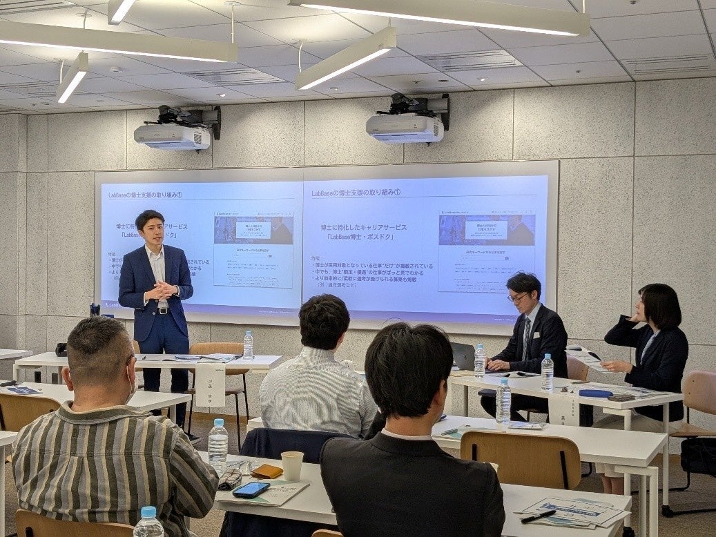 国内理系大学院生の2人に1人が登録、700社以上が採用に活用している理系人材のキャリア支援プラットフォームを運営するLabBase代表の加茂からは、2024年7月10日開催の『未来の博士フェス2024』の「博士を大事にする企業ピッチコンテスト」で文部科学大臣表彰を受賞した博士専用のキャリア支援プラットフォーム「LabBase博士・ポスドク」についても紹介。